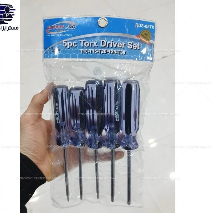 ست پیچ گوشتی ستاره ای 5 عددی برند رایدر پرو دسته شیشه ای مدل RAIDER PRO RDS-05TX آلنپیچ گوشتی ستاره ای یکی از ابزار های کاربردی در مصارف خانگی و صنعتی می باشد.اگر به تعدادی از این ابزار با ابعاد مختلف و سریهای ستاره ای نیاز دارید، ما یک مجموعه ای را به شما معرفی میکنیم که باکیفیتی مناسب، توسط شرکت «رایدر پرو» (RAIDER) تولید شده است.شرکت RAIDER محصولات مختلفی را در خصوص ستهای پیچگوشتی تولید کرده است. ست 5 پارچه یکی از این محصولات است.این ست پیچگوشتی دارای دسته شیشه ای رنگ آبی سورمه ای می باشد و شامل 5 عدد پیچ گوشتی ستاره ای می باشد.میله این پیچگوشتیها از جنس کروم وانادیوم، سختکاری شده .این ست، با یک کیف پلاستیکی در اختیار شما قرار خواهد گرفت و برای کارهای مختلف خانگی، کارگاه بسیار مناسب است.تعداد و تنوع ابزارهایی که در منزل یا خودرو استفاده میکنیم غالبا محدود است و بیشتر آنها ابزارهای دستی و بدون نیاز به برق و باتری و غیره است. شاید شما ترجیح دهید که با هزینهای کم این ابزارها را در اختیار داشته باشید.