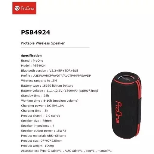یکی از تجهیزات لذت بردن از مهمانیها، مسافرت، کمپها و حتی سر کردن در تنهایی خود داشتن یک اسپیکر است که چه بهتر این ابزار از نوع اسپیکر بلوتوثی باشد تا محدودیتی در استفاده از آن در شرایط و مکانهای مختلف نباشد. اسپیکر بی سیم شارژی پرووان PSB4924 میتواند یکی از گزینههای خوب برای انتخاب باشد؛ چون با داشتن دو بلندگوی بزرگ 78 میلی متری، خروجی بلندگوی 30 وات و امپدانس 4 اهم صدایی واضح را در اختیارتان قرار میدهد.
