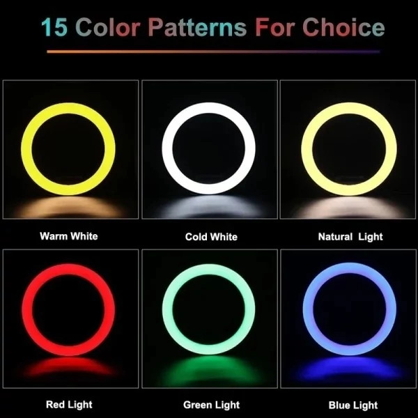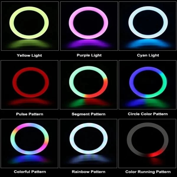 رینگ لایت RGB LED سایز 26 سانتی متر دارای 15 طیف رنگ و قابلیت تنظیم روشنایی در 10 حالت قابلیت تنظیم رنگ های سرد-گرم وطبیعی بوسیله ریموت مناسب برای عکاسی و فیلمبرداری حرفه ای قابلیت چرخش 360 درجه قطر خارجی رینگ لات : 26 سانتی متر امکان نصب نور بر روی سه پایه دارای پایه نگه دارنده گوشی که تا سایز 6.5 اینچ ساپورت میکند فرکانس نور 50-60 HZ دارای نور 1000 لومن ولتاژ ورودی: 5 ولت توان خروجی نور: 20 وات دارای 9 طیف رنگ دارای 15 حالت نور ترکیبی RGB