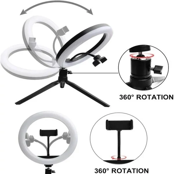 رینگ لایت RGB LED سایز 26 سانتی متر دارای 15 طیف رنگ و قابلیت تنظیم روشنایی در 10 حالت قابلیت تنظیم رنگ های سرد-گرم وطبیعی بوسیله ریموت مناسب برای عکاسی و فیلمبرداری حرفه ای قابلیت چرخش 360 درجه قطر خارجی رینگ لات : 26 سانتی متر امکان نصب نور بر روی سه پایه دارای پایه نگه دارنده گوشی که تا سایز 6.5 اینچ ساپورت میکند فرکانس نور 50-60 HZ دارای نور 1000 لومن ولتاژ ورودی: 5 ولت توان خروجی نور: 20 وات دارای 9 طیف رنگ دارای 15 حالت نور ترکیبی RGB